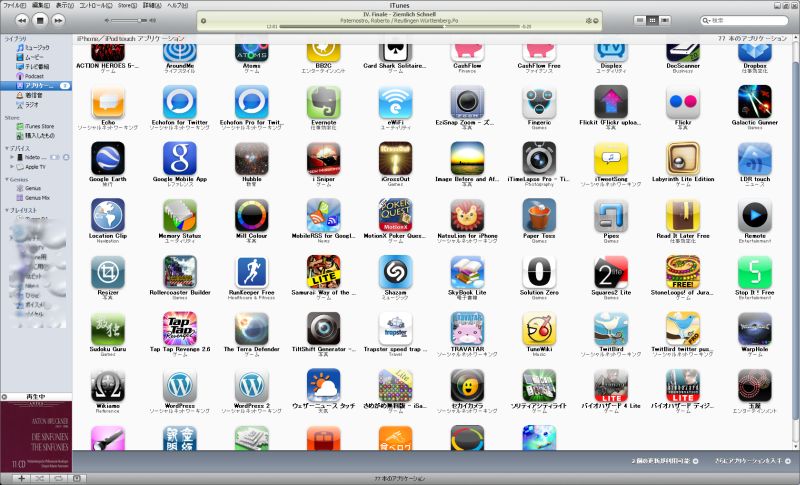 iPhone:アプリの数が77本2009.11.23iPhone ふと見ると、iPhone用にダウンロードしたアプリの数が77本だった。 ただそれだけなんだけど、なんかキリの良い数字な気がしたのでキャプチャ画面を上げとくよ。