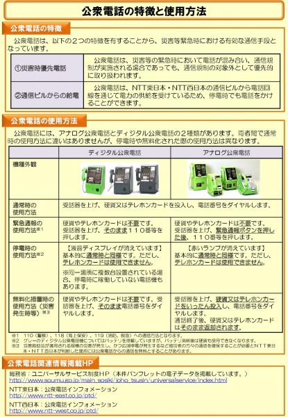 総務省から公衆電話の特徴と仕様方法をまとめたPDFファイルが配布されていますので、家族みんなで使い方や設置場所など確認しておくことをお薦めします。