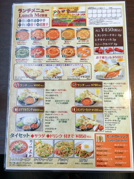 ランチのメニューはこんな感じ。カレーを選べる各種セットと、他にはタイセットなどもありました。