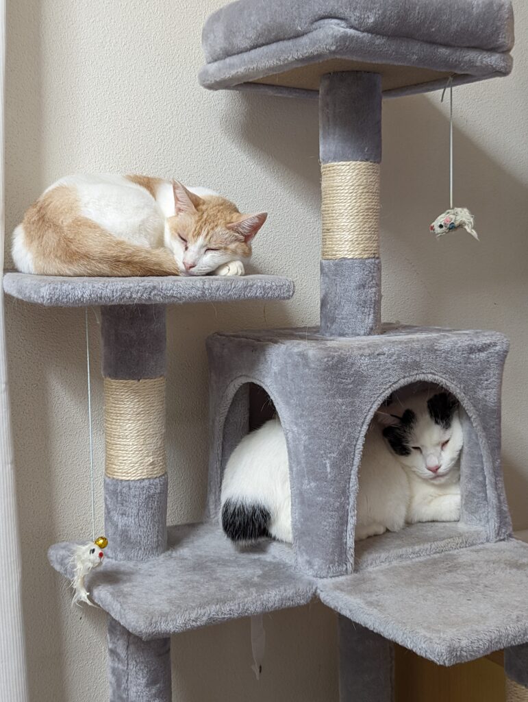 キャットタワーでくつろぐサスケとチャコ。大体ここが定位置。