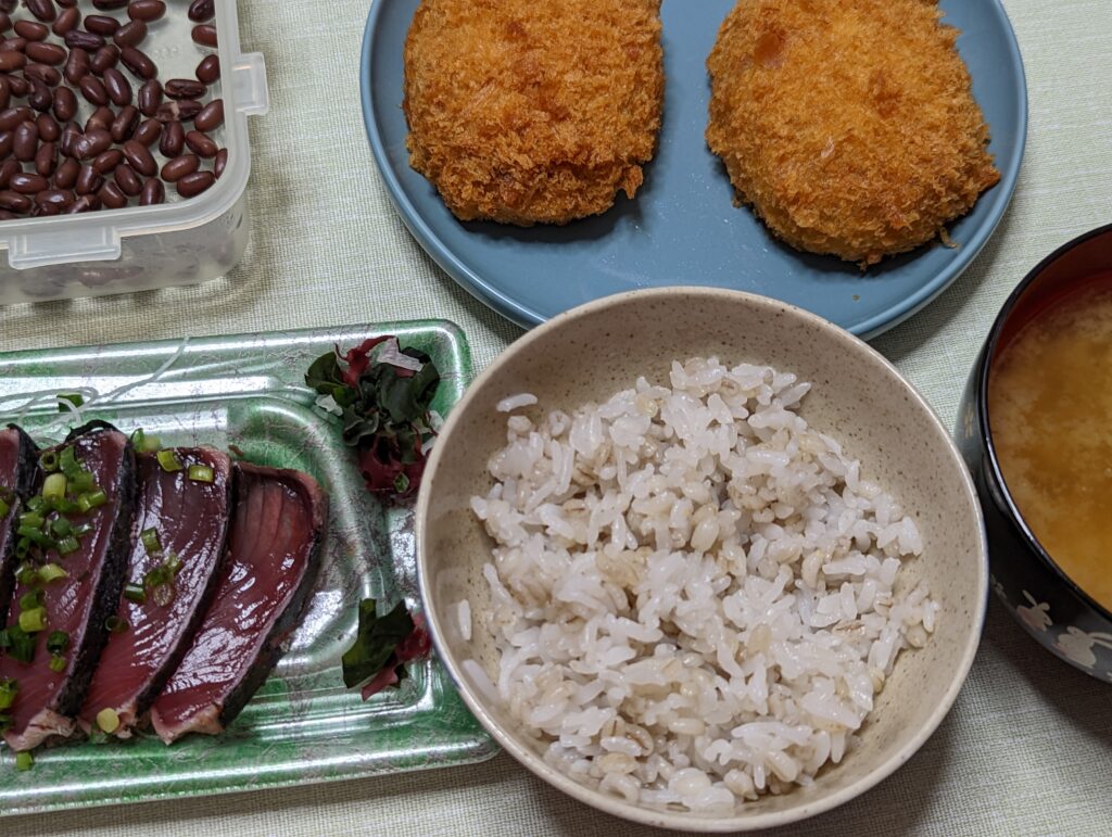 夕食。カツオのたたき、コロッケ、蒸しあずき、味噌汁、野菜サラダ。台風なのでコロッケを買ってきました。