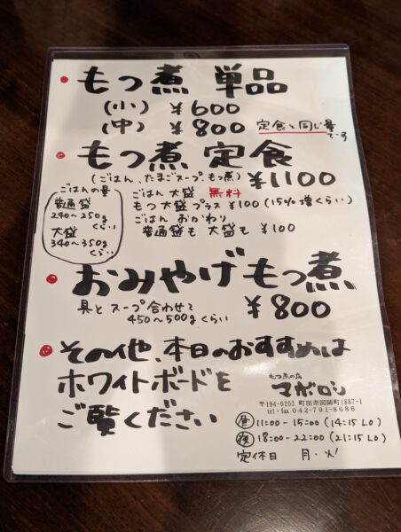 町田・相模原エリアのカレー好きなら知らぬモノのない名店「カレーの店 マボロシ」の2号店ながら、なぜかカレーではなくもつ煮を出すお店。以前から存在は知っていたモノの、車でしか行けない場所なので中々足が伸びずにいたけど、この度ついに訪店を果たすことができました。