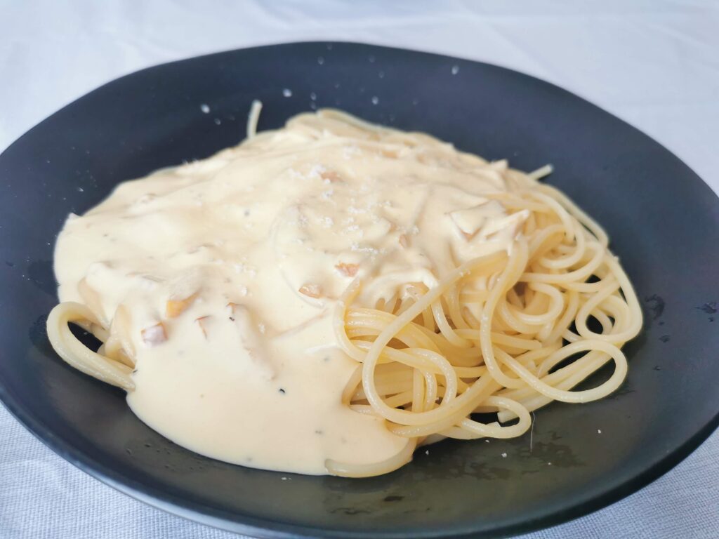 昼食。レンチンで温めるタイプのカルボナーラソース「生クリームとゴーダチーズの濃厚カルボナーラ」を掛けたカルボナーラ。味はボチボチだけど、レンチンで済む手軽さは評価したい。