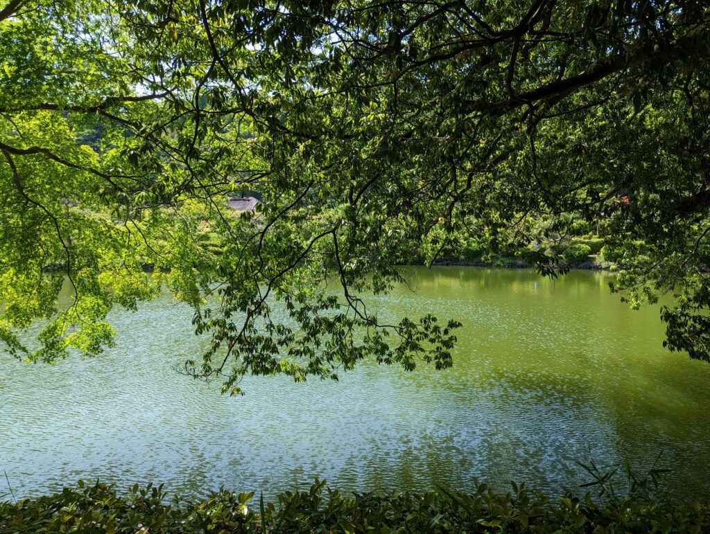 奥さんのリクエストで薬師池の藤棚を見にいったけど、藤の花の時期は終わりかけていた。でもベンチに座って風に吹かれながらみる緑も悪くない。