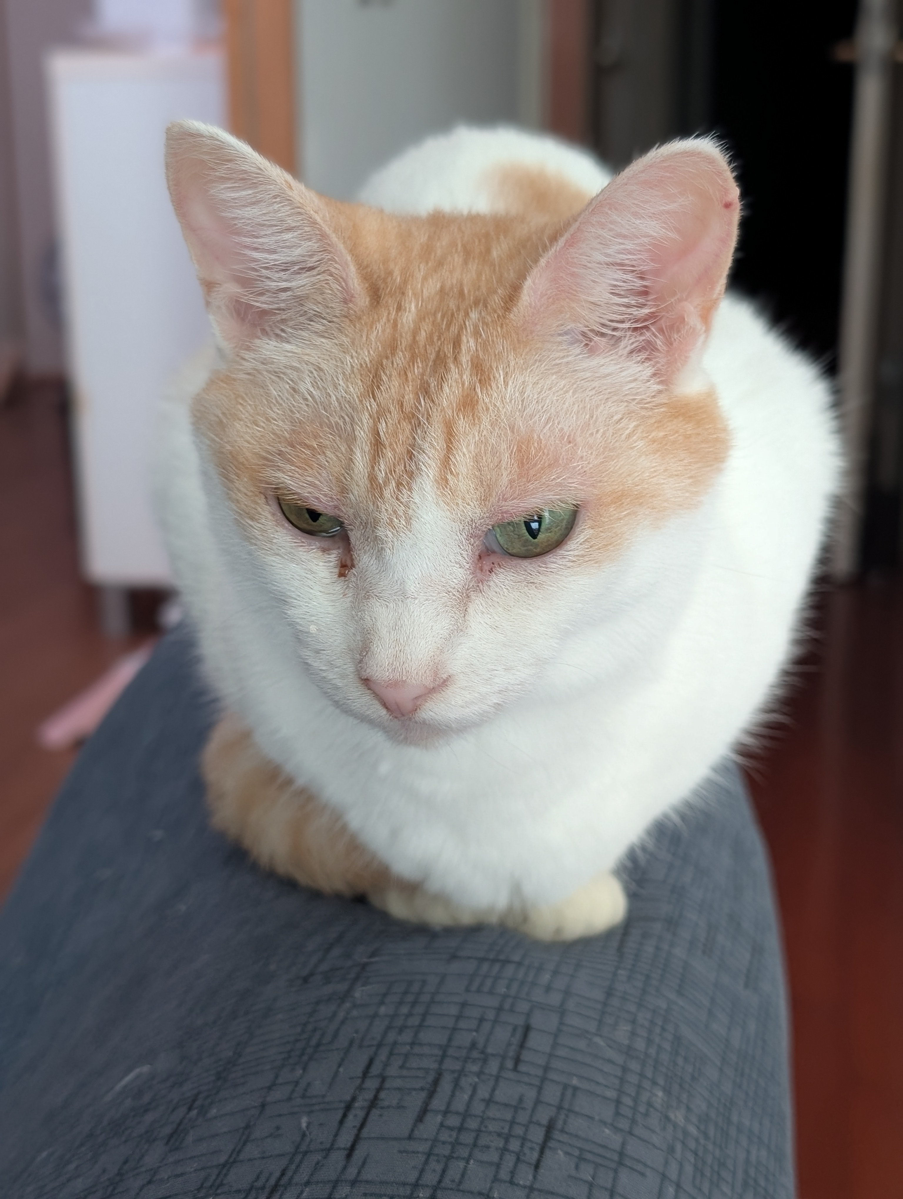 静かな朝の光の中で、何も語らず背中で語るタイプ。毛並みの白さがやわらかくて、思わず触りたくなる。