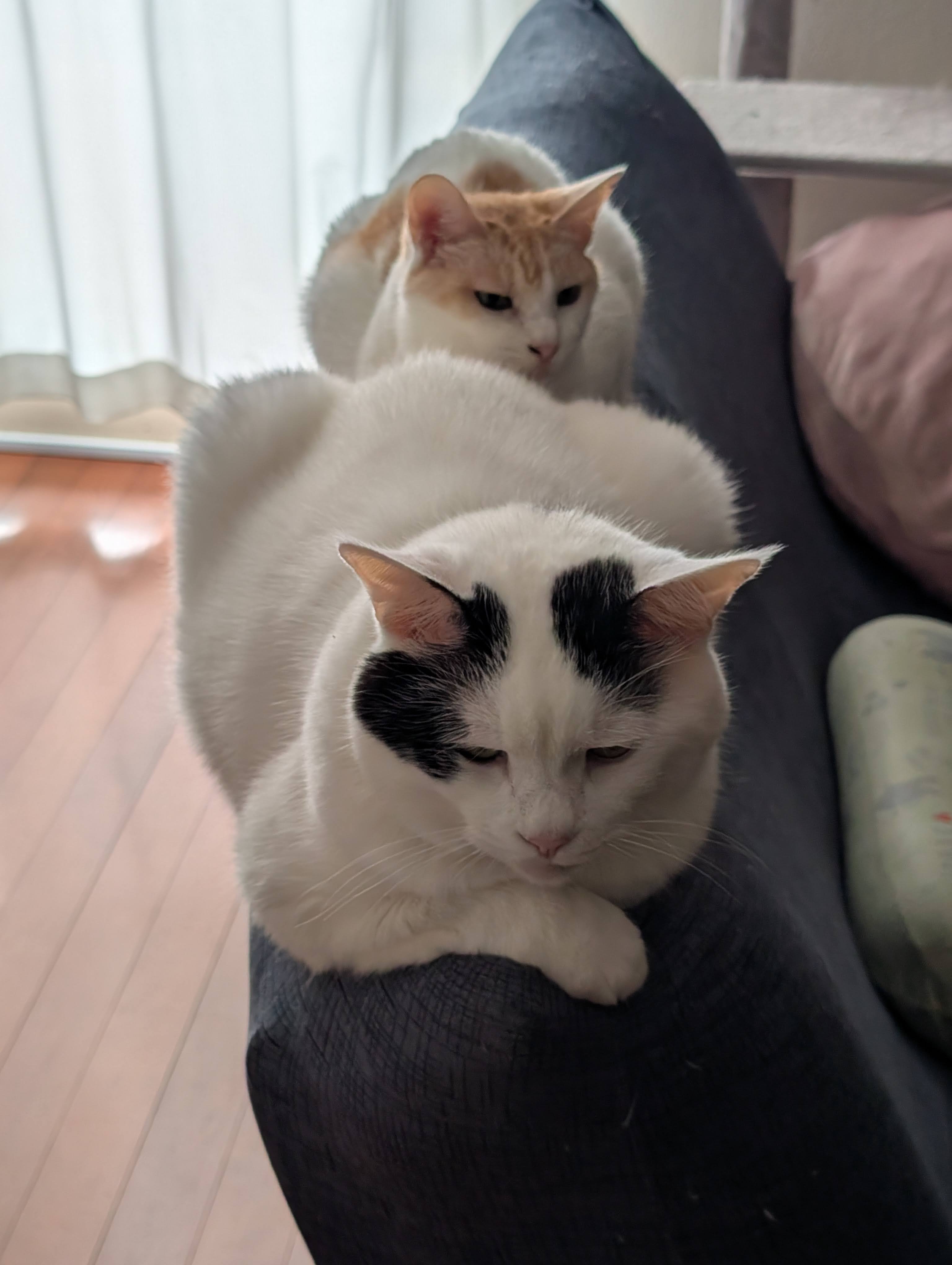 冬用ソファーで仲良くくつろぎ中。暗い場所で撮ったので、少し明るく補正してます。