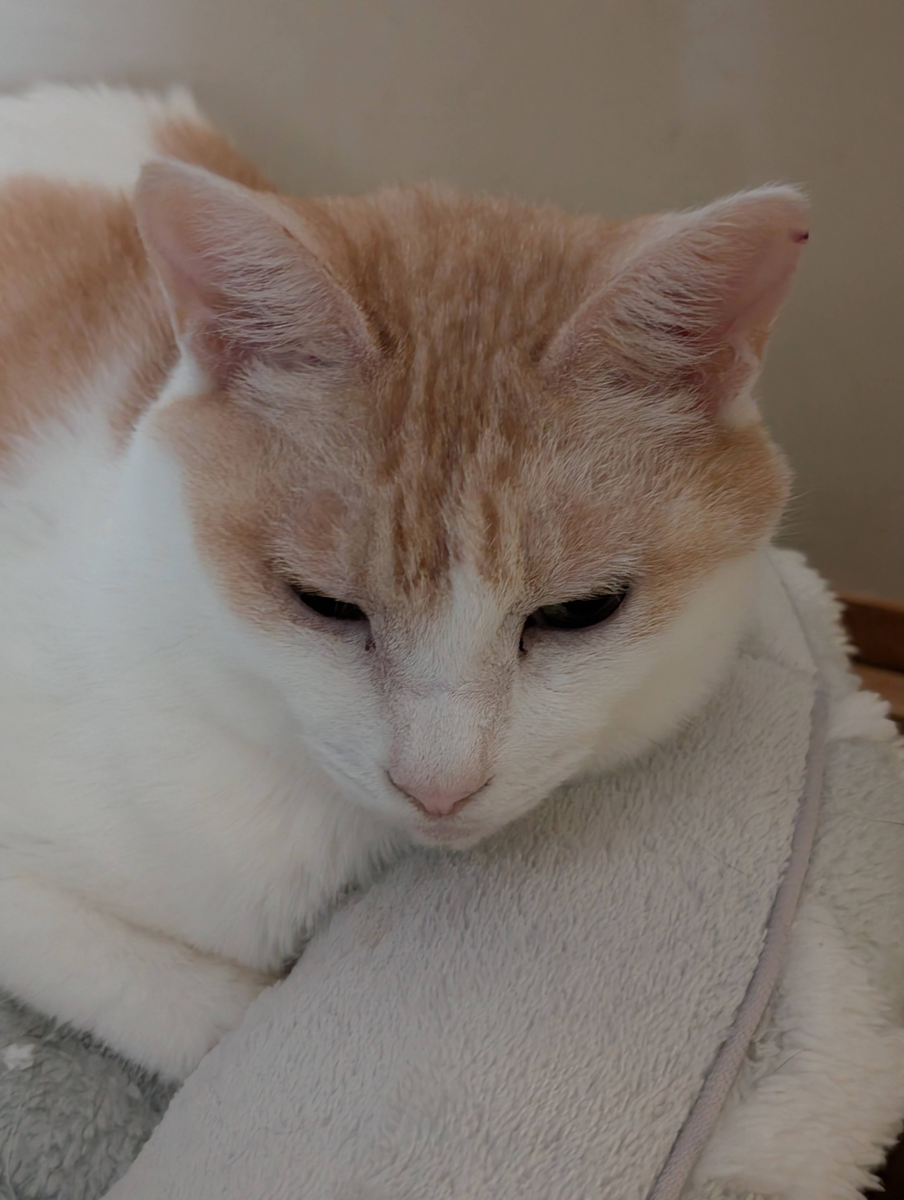 チャコがサスケにくっついて安心している様子。ふたりで丸くなって同じベッドに収まっている。