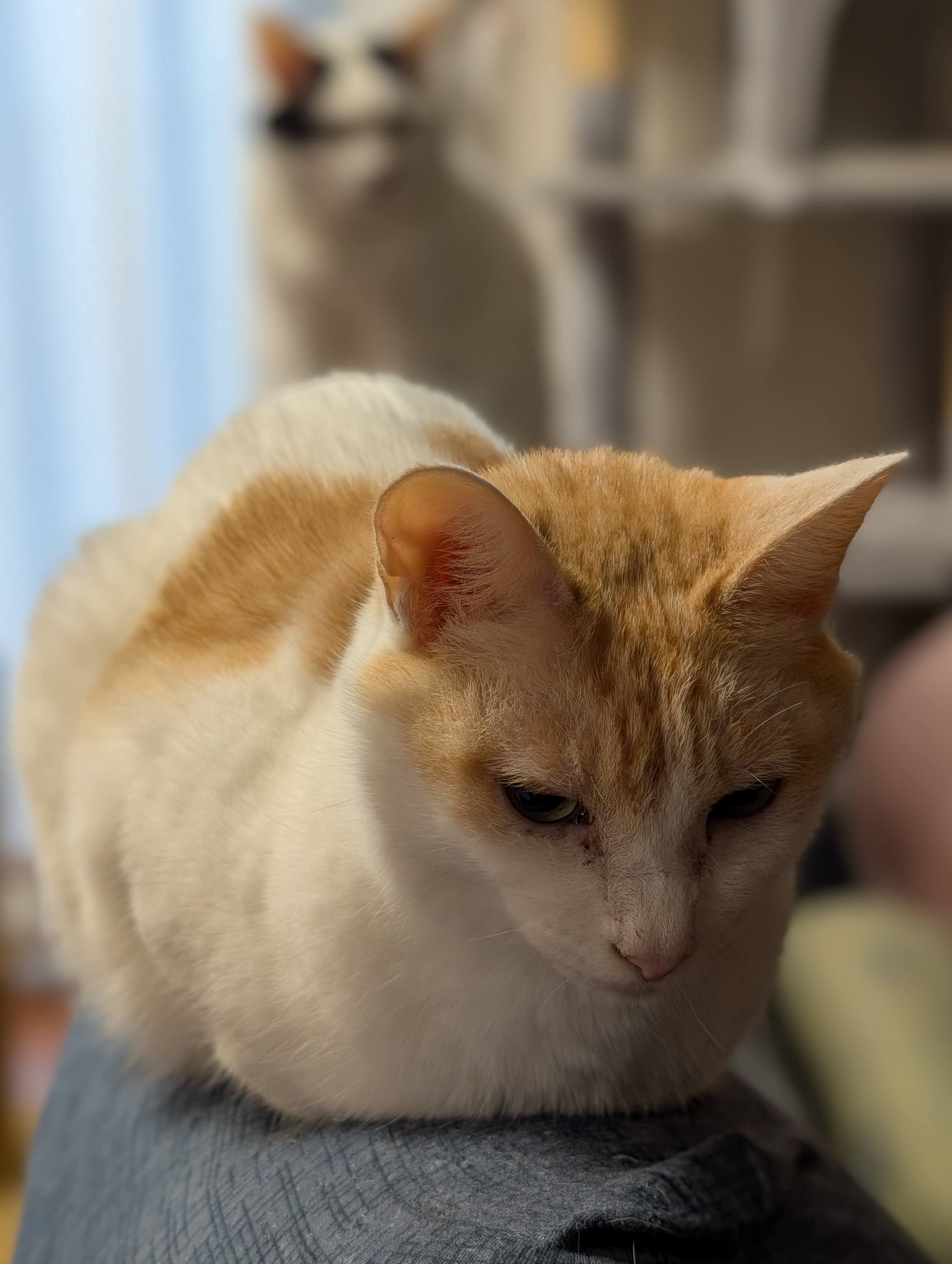 普段は控えめなチャコも、2段重ねの爪とぎタワーに乗ると別猫のような風格になる。背筋を伸ばし、悠然と座り込む姿はまさに「女王」。下でウロウロしているサスケは臣下扱いだ。