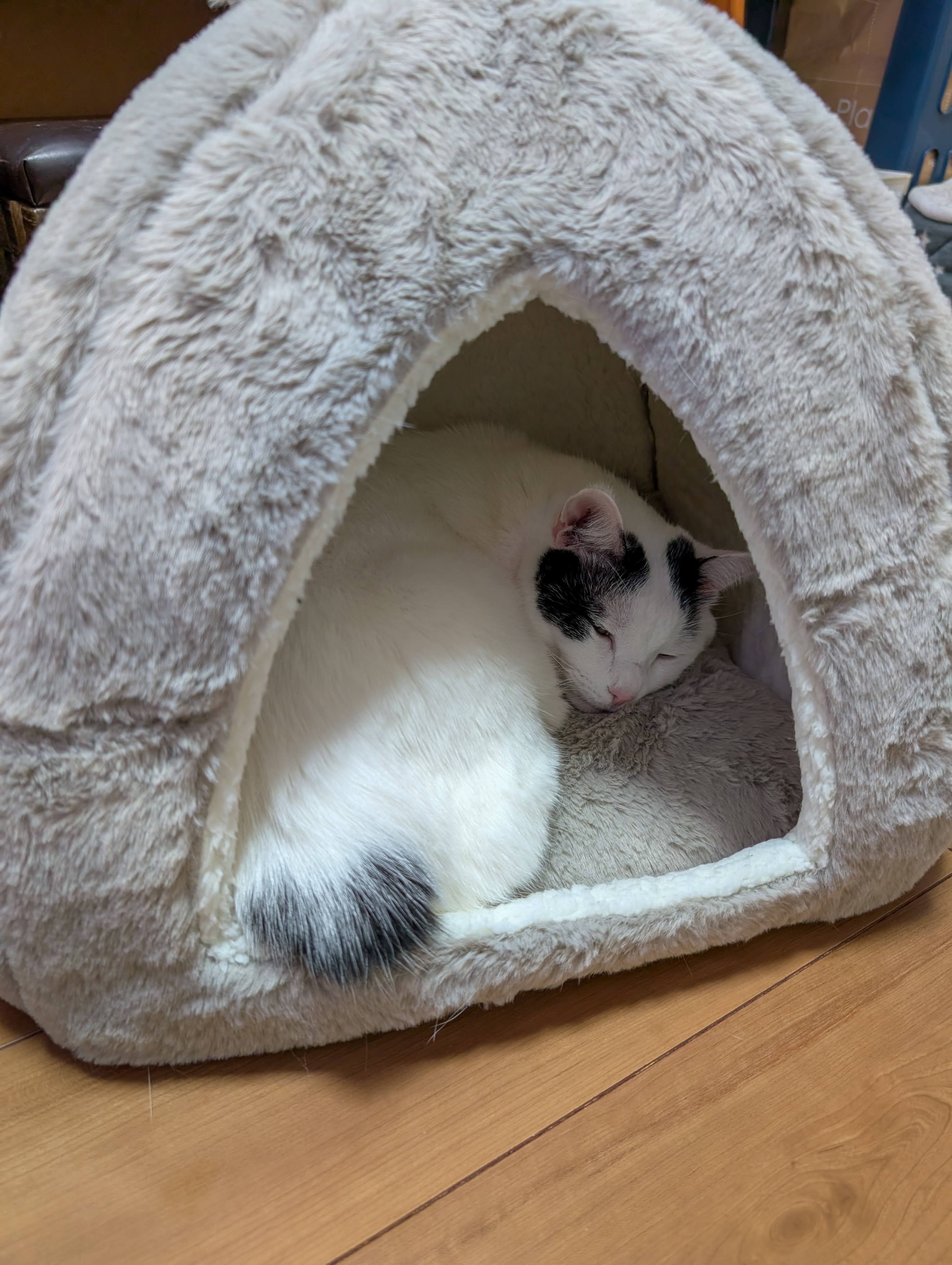 丸くなって、目を細めながら少しずつ意識が遠のいていくチャコちゃん。完全に寝るわけでもなく、こちらの気配は感じつつ、ウトウトの境目を行ったり来たりしている様子が伝わってくる。