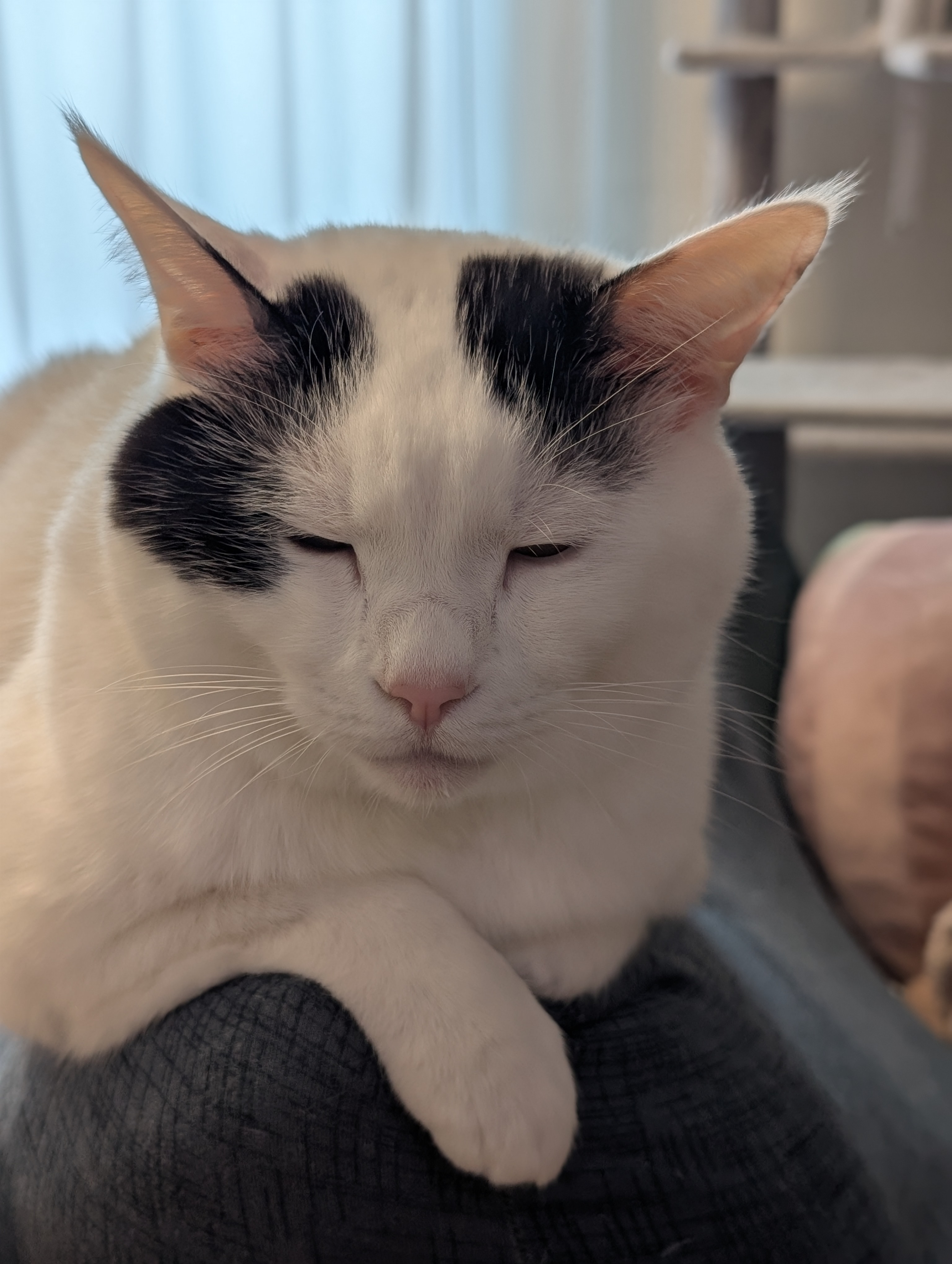 ソファーの背もたれでキリッとした顔を見せるサスケくん。顔はイケニャンだけど、お腹を舐めすぎて剥げています。