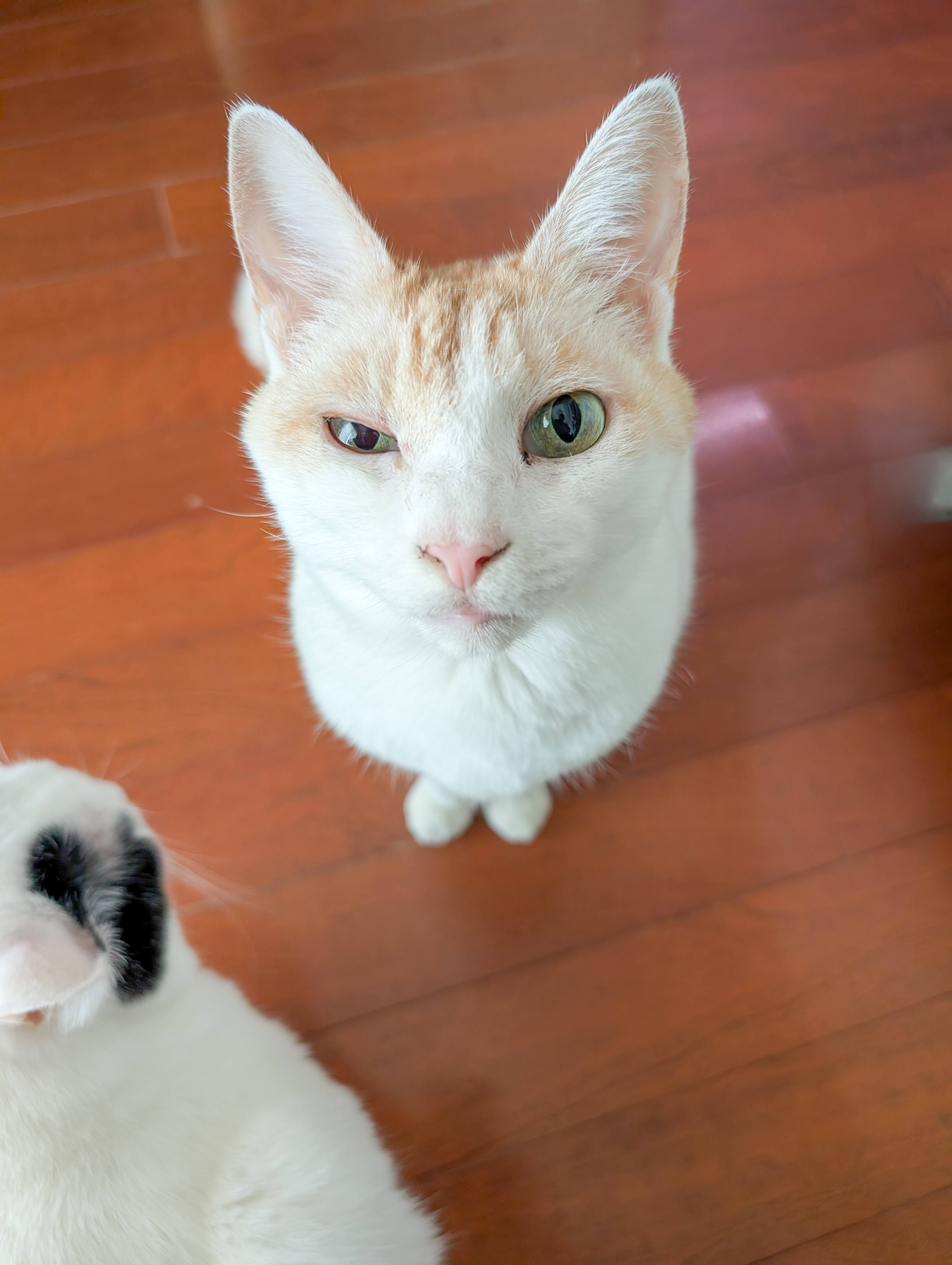 チャコもソファの上で丸くなっている。茶色と白のふわふわした毛並みが柔らかくて、見ているだけで癒されるんですよね。背景にはサスケの姿もちらり。同じソファの上にいて、それぞれが好きな場所でくつろいでいるこの距離感が、うちの猫たちらしくてたまらない。
